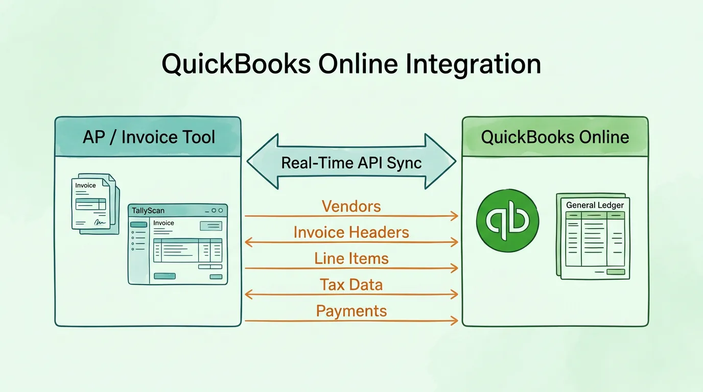 TallyScan integrates directly with QuickBooks Online via real-time API sync — invoices captured from email or portals, extracted with 98%+ field accuracy, approved through your configured workflow, and posted to QuickBooks automatically. For a broader look at what this integration enables across your financial workflow, see our guide on syncing invoices to QuickBooks, Xero, and Google Drive and our overview of streamlining invoice processing.