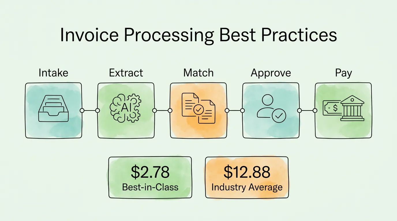 According to Ardent Partners' State of ePayables research, the industry average cost per invoice is $12.88, and the average processing time is 17.4 days. Best-in-class teams process the same invoice for $2.78 in 3.1 days. The companies at the top of that benchmark did not get there by hiring better accountants. They got there by eliminating the manual steps where the cost accumulates.