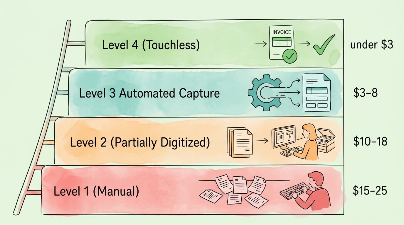 Level 1 — Manual: Paper invoices, email attachments processed one at a time, data entered manually into accounting software. If you are still in this stage, you might find our guide on how to organize invoices a helpful starting point. Approval happens via email chain or in-person. No systematic tracking of outstanding invoices. Cost per invoice: $15 to $25.